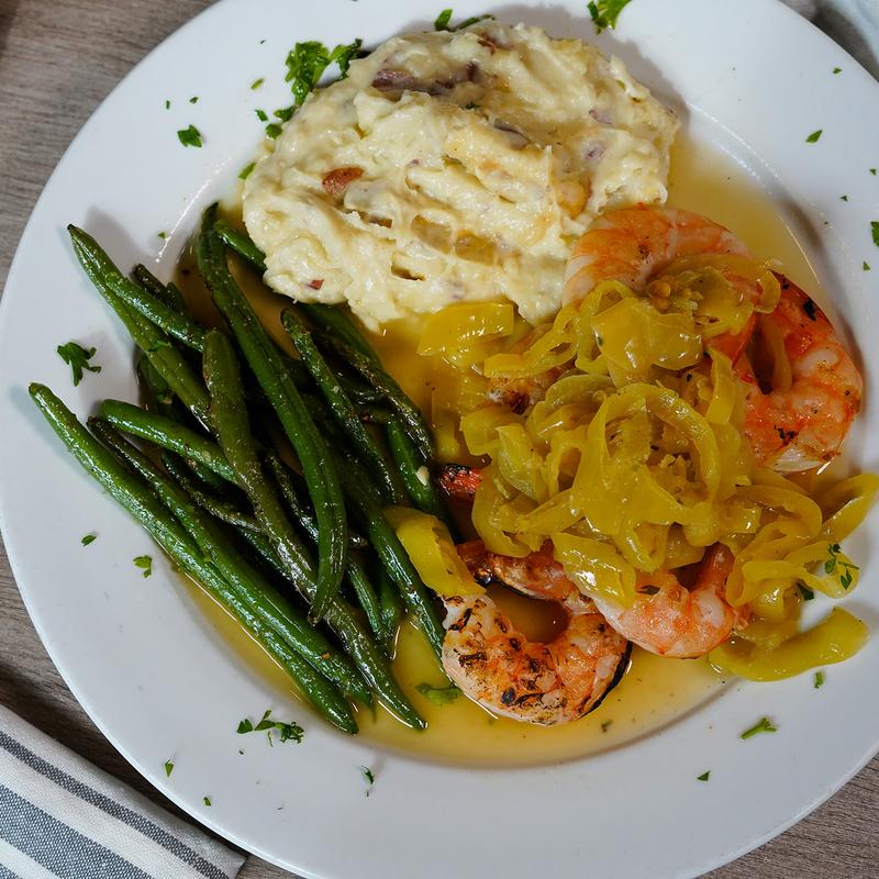 6 grilled jumbo shrimp with sautéed onions, garlic, & roasted red peppers in a spicy saffron white wine lemon butter sauce